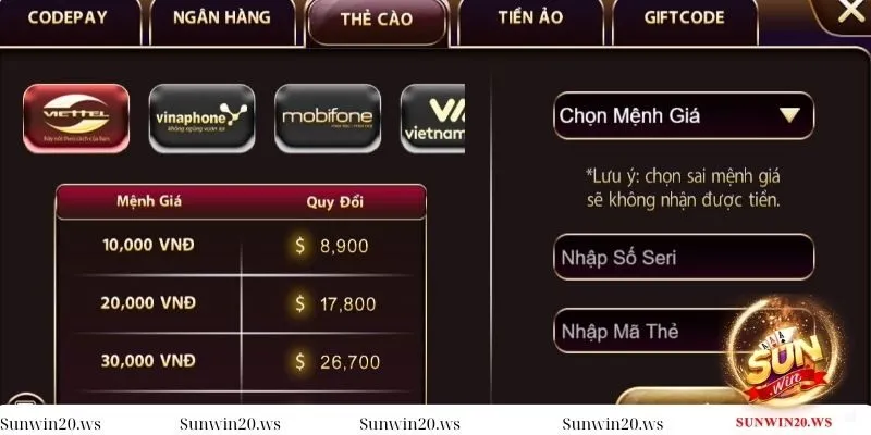 Một cách thức nạp tiền Sunwin nhanh chóng và cực kỳ thuận tiện đó chính là qua thẻ cào của các nhà mạng lớn như Viettel, Vinaphone, MobiFone. Tại đây, cược thủ chỉ cần nhập mã thẻ cào và mệnh giá mong muốn và nhấn chọn Hoàn tất. Việc chuyển tiền vào tài khoản thông qua thẻ cào sẽ giúp anh em tiết kiệm thời gian và tham gia vào sảnh game dễ dàng.